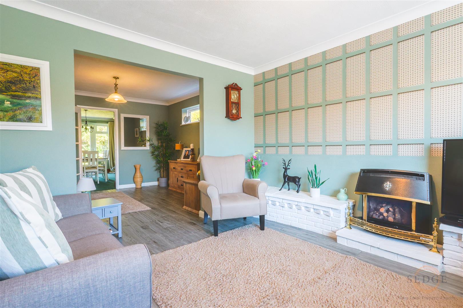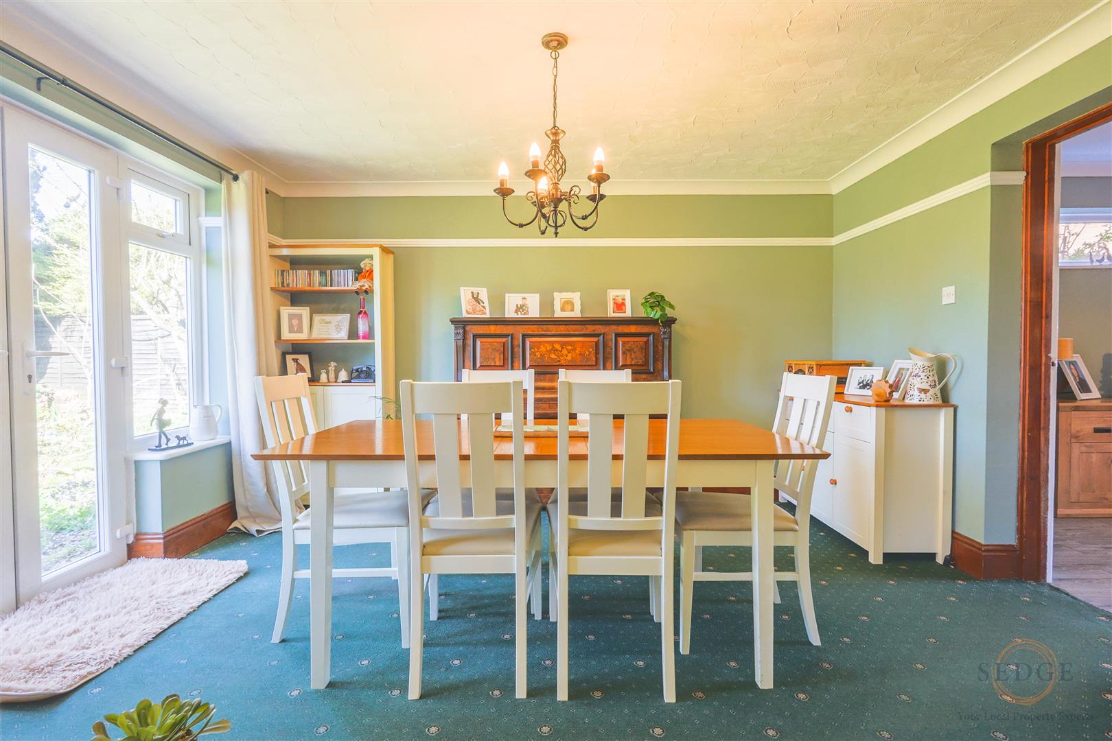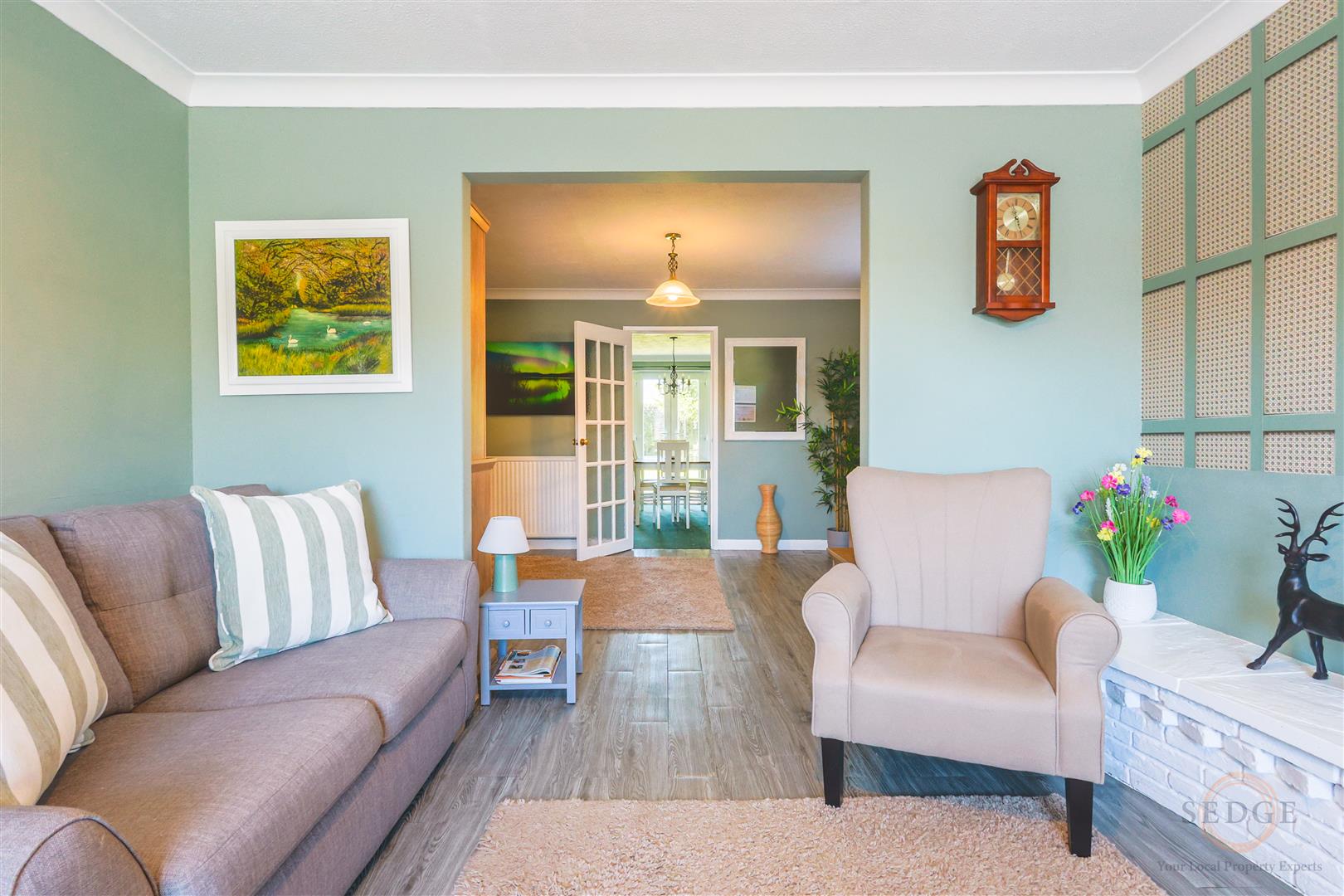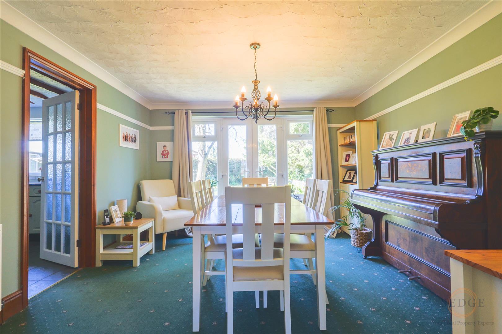 Dining Room: 4.34m x 3.81m – two windows to rear, double doors to garden.