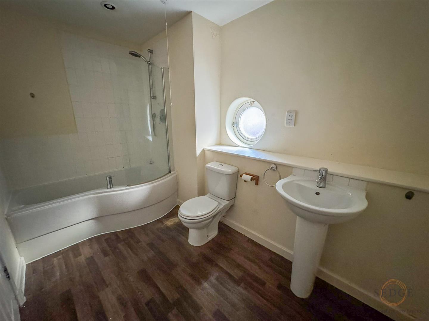 With a porthole window to the rear aspect, the bathroom includes a three-piece suite comprising a low-level WC, pedestal wash hand basin, and curved panel bath with shower over. Additional features include a radiator, tiled splashbacks, and ceiling spotlights.