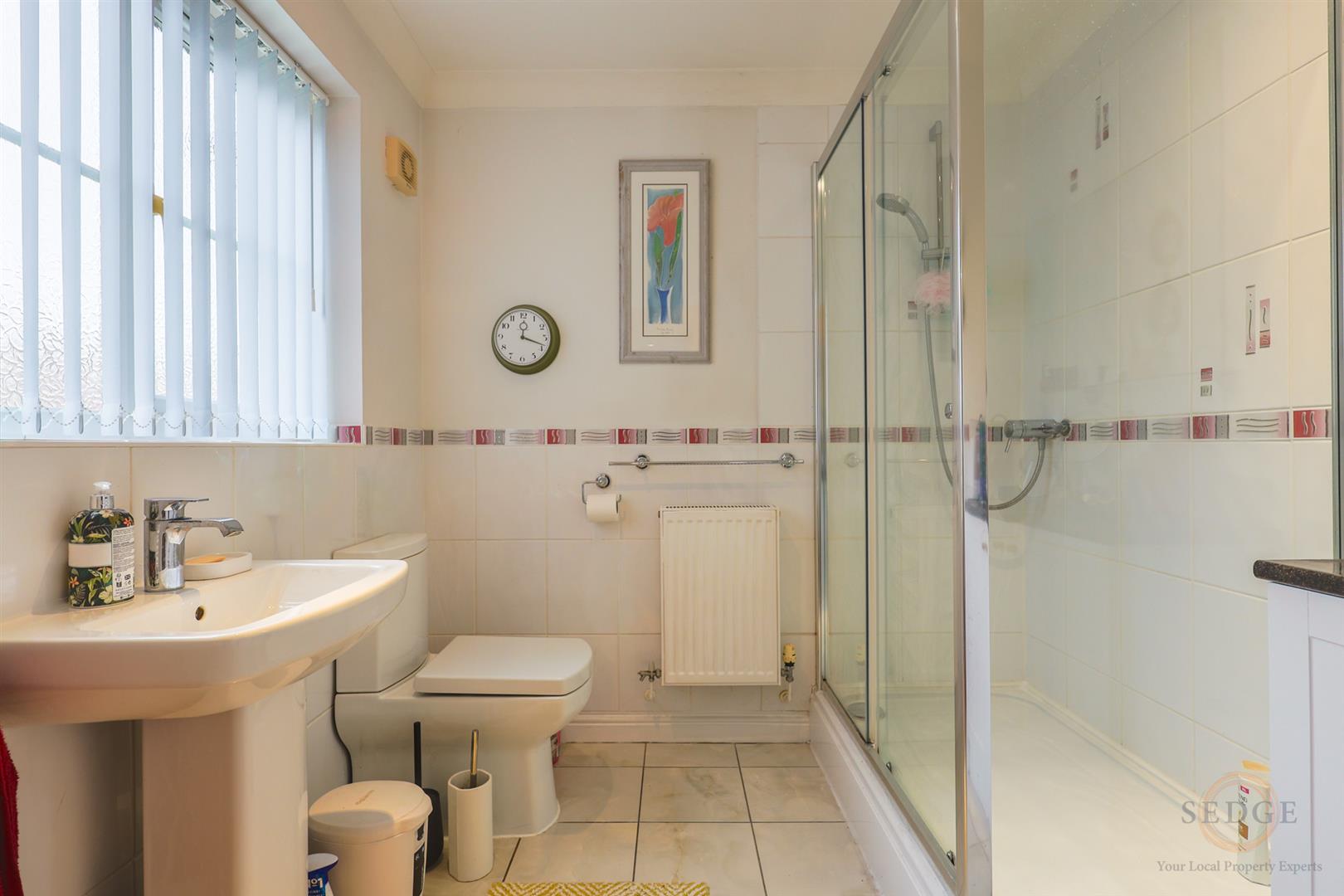 Fitted with a modern three-piece suite comprising low-level WC, pedestal wash hand basin with mixer tap and shaver point, and a fully tiled double shower cubicle with thermostatic shower. Complemented by tiled flooring, part-tiled walls, inset LED lighting, double radiator, and obscured UPVC double-glazed window to the front elevation.