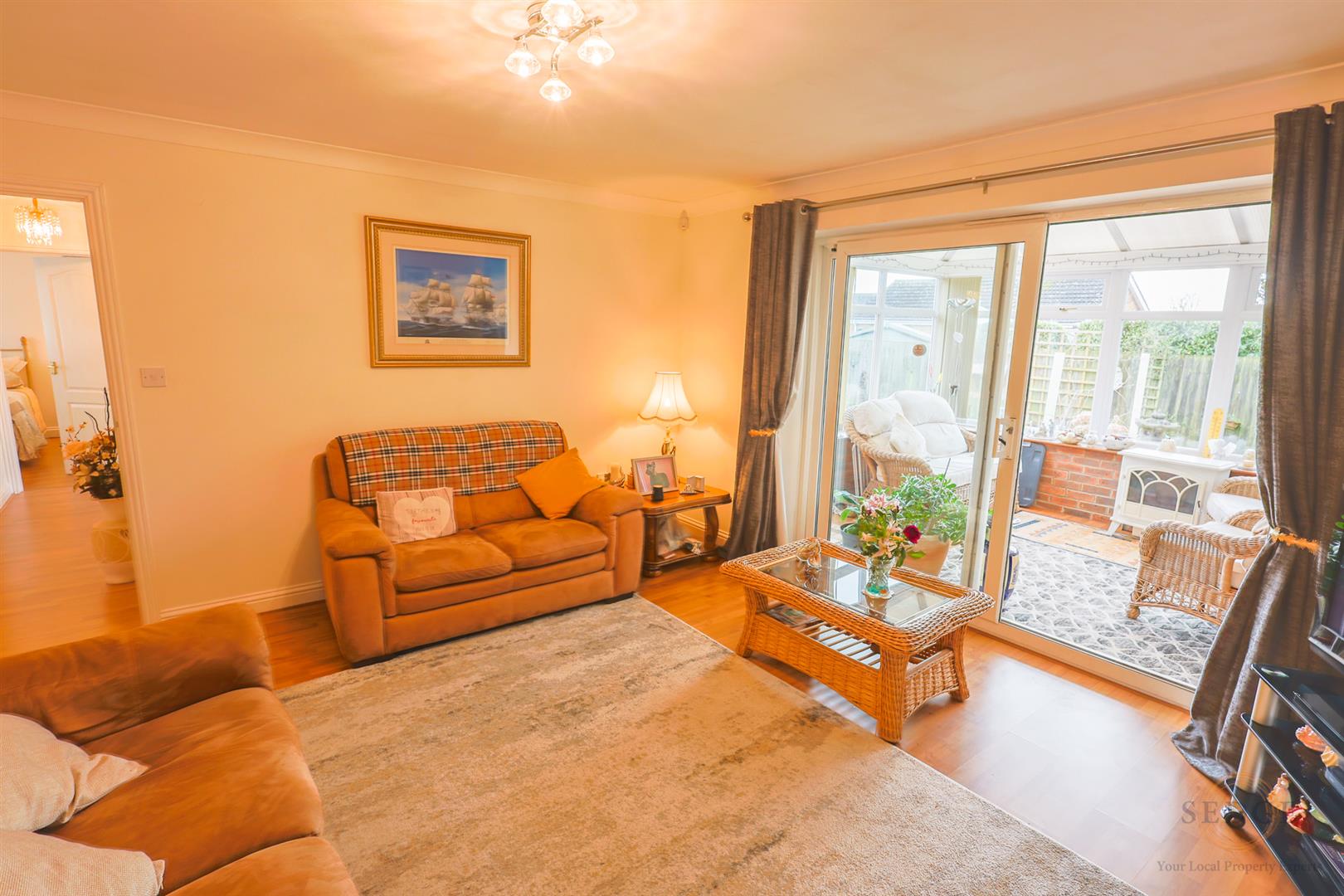A bright and inviting living space featuring sliding patio doors opening directly into the conservatory, allowing plenty of natural light. The room is centred around a feature fireplace with wooden surround, marble insert and hearth, and fitted coal-effect electric fire. Additional features include laminate flooring, double radiator, TV and telephone points, and skimmed and coved ceiling.