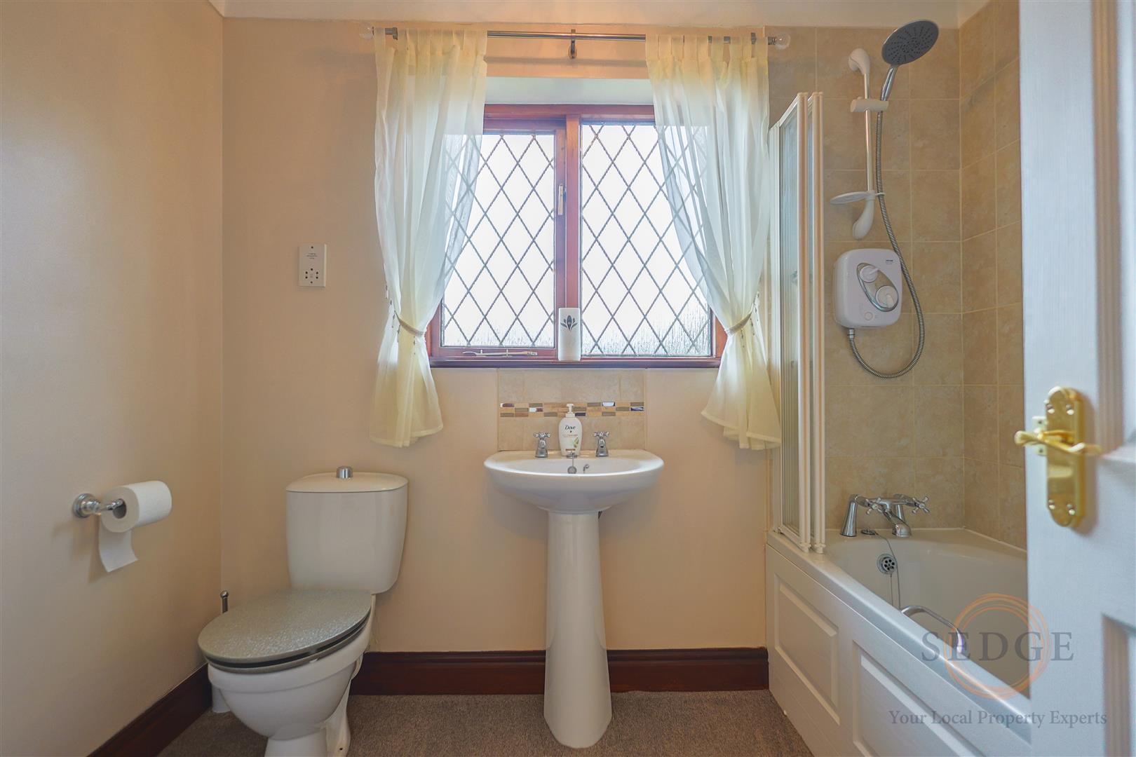 The first floor offers four well-proportioned bedrooms. The principal bedroom spans the width of the property with dual front-aspect windows and an en suite shower room. Three further bedrooms are served by a family bathroom and a central landing with storage cupboard.