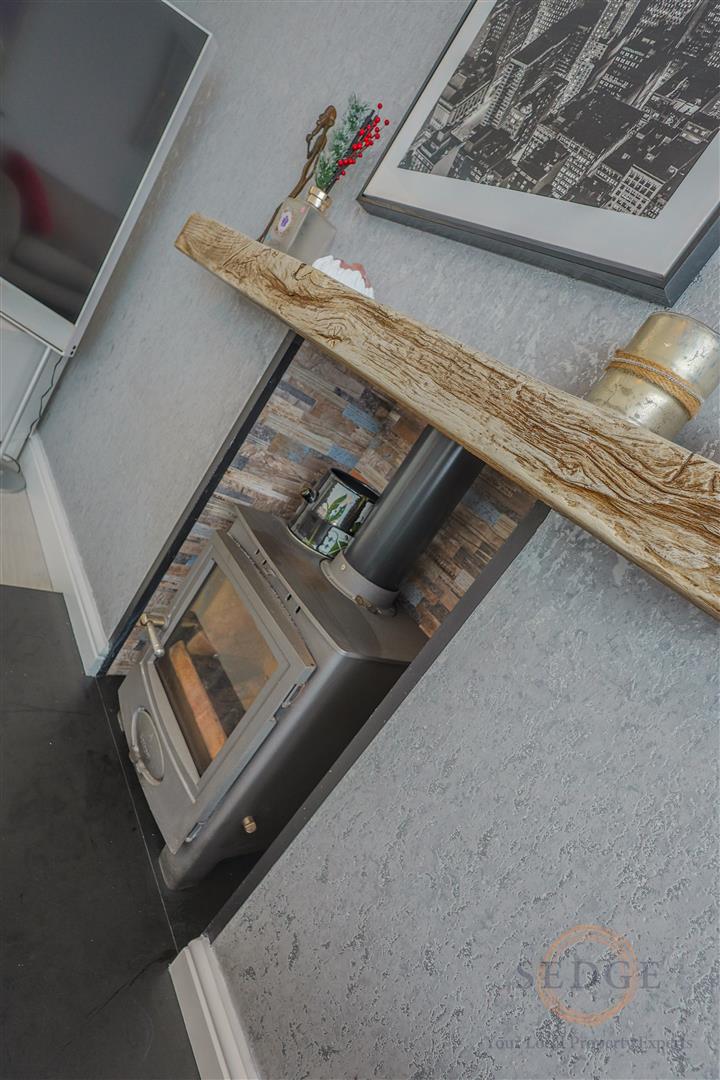 Beautifully presented living space with a feature multi-fuel burner set into a recess with oak mantle and marble hearth, laminate flooring, TV point, and large front-facing window. A wide square arch opens through to the dining area.