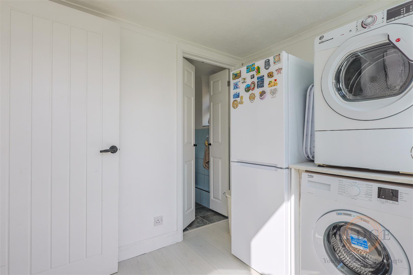 Rear-facing utility space with plumbing and space for washing machine, tumble dryer, and fridge/freezer. Obscured UPVC glazed door leads to the garden.