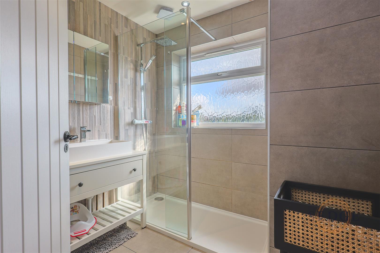 Stylish and contemporary shower room with fully tiled walls and floor, walk-in rainfall shower with additional attachment, WC, and vanity unit with wash basin and drawer below. Finished with inset LED lighting, illuminated medicine cabinet, extractor fan, and a wall-mounted electric pebble effect display fire.