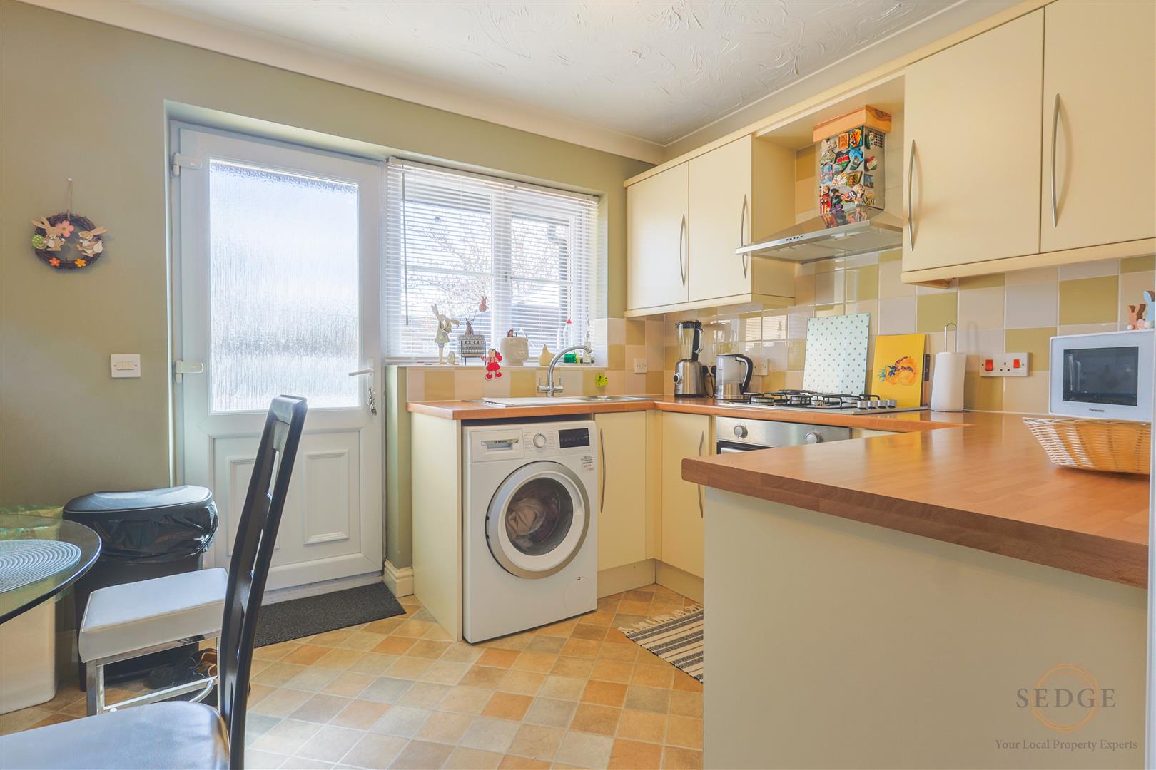 UPVC double glazed window to rear and door to garden, fitted with a range of wall and base units, work surfaces, stainless steel sink, integrated gas hob and electric oven with extractor over, space for appliances, radiator.