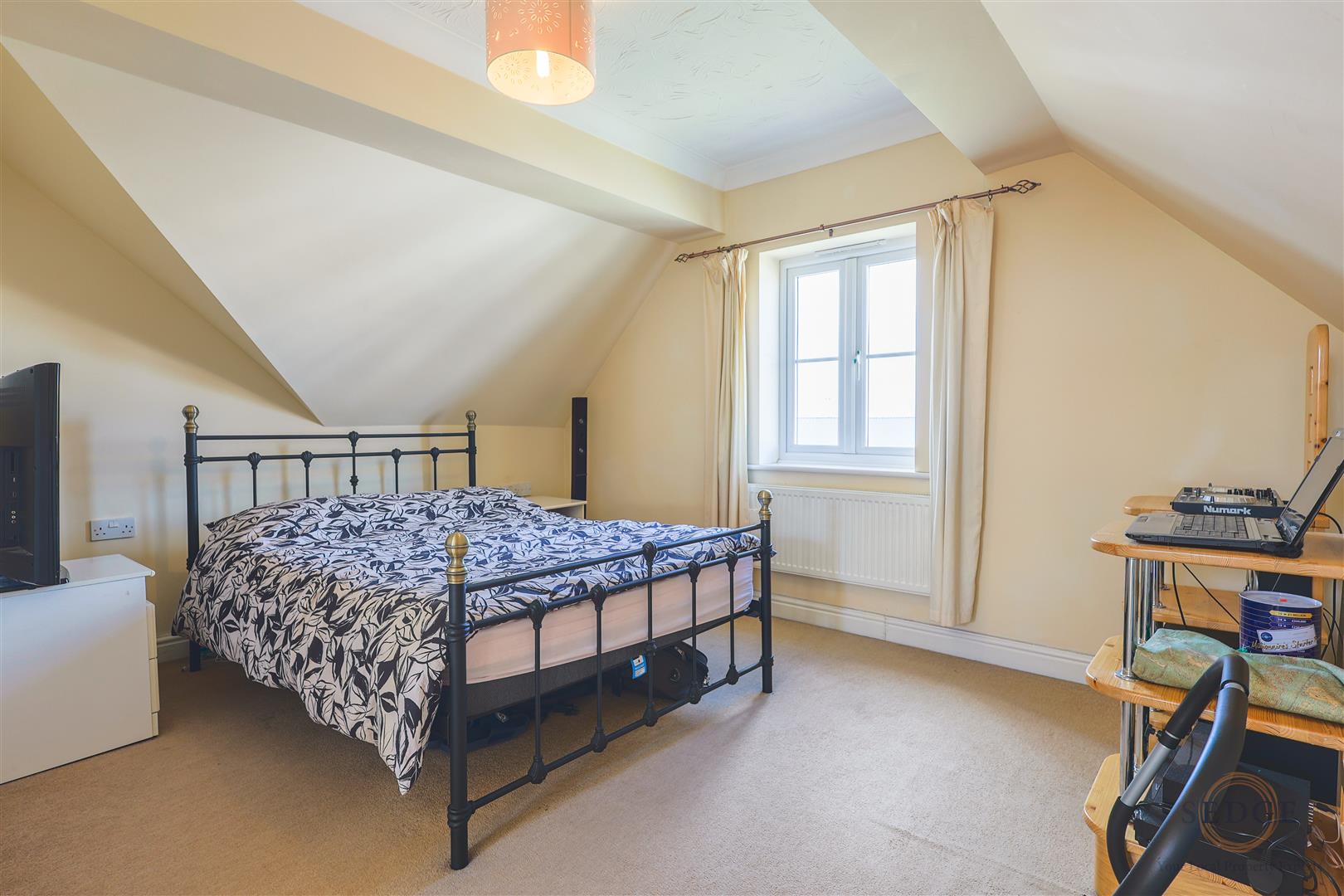 UPVC double glazed bay window to front, radiator, TV point, under-stairs storage.