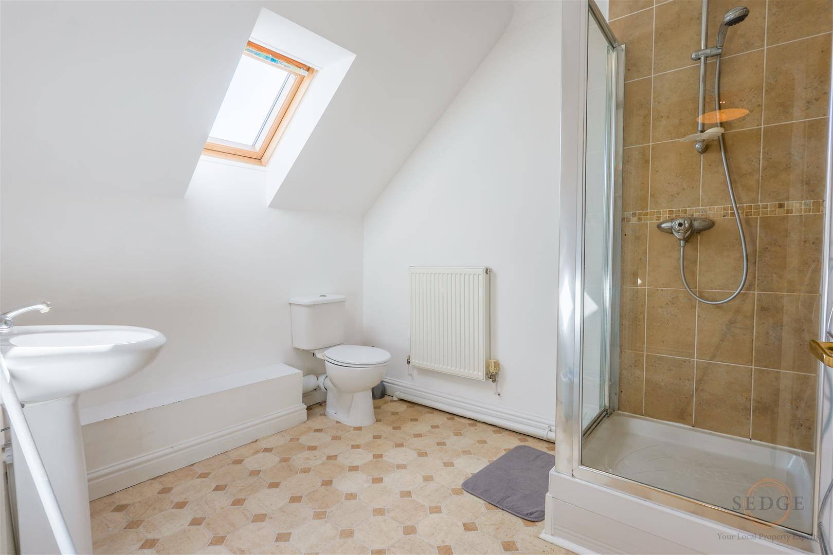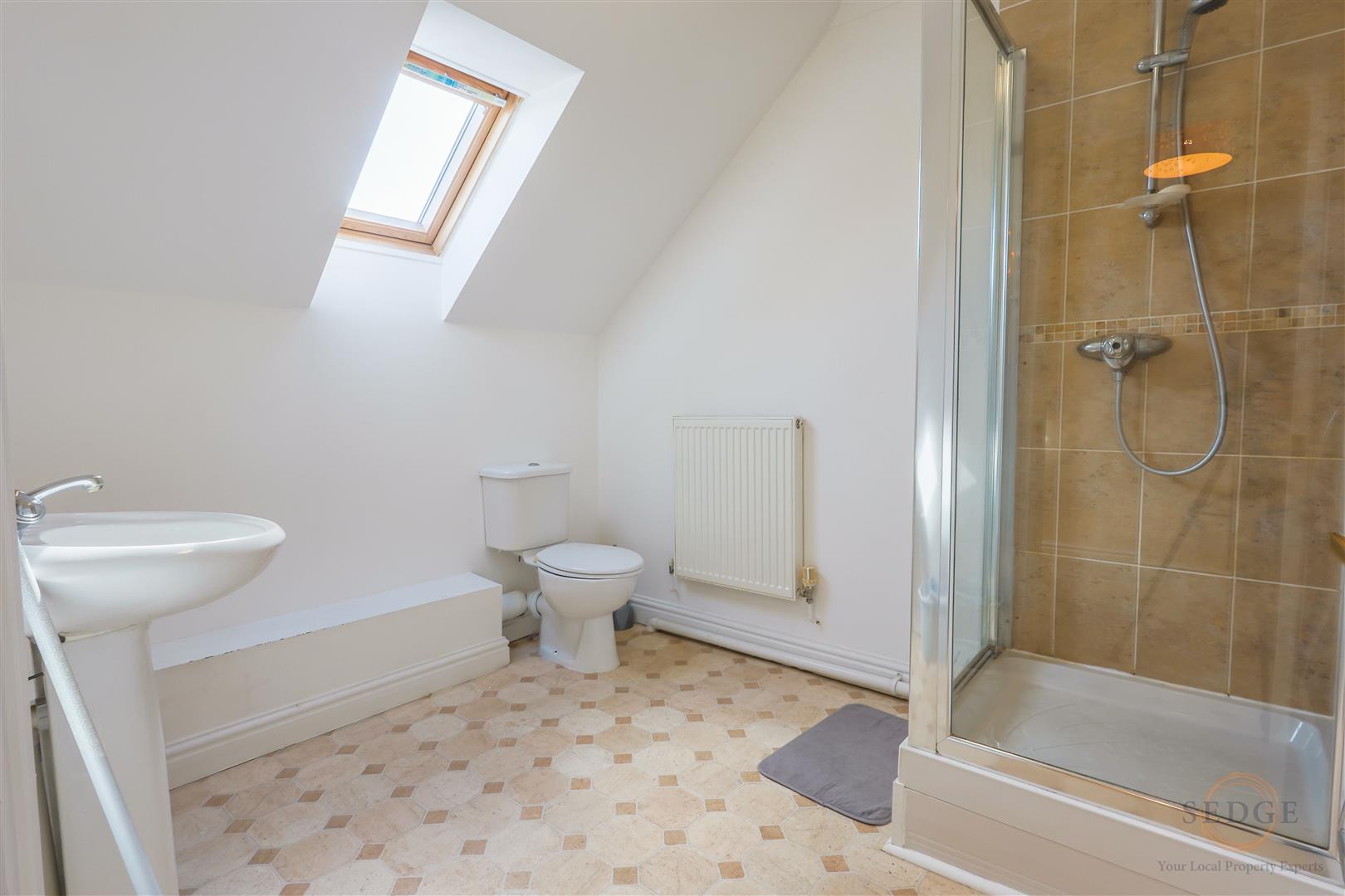 Fitted with shower cubicle, wash hand basin and WC, Velux-style window, tiled splashbacks, radiator.