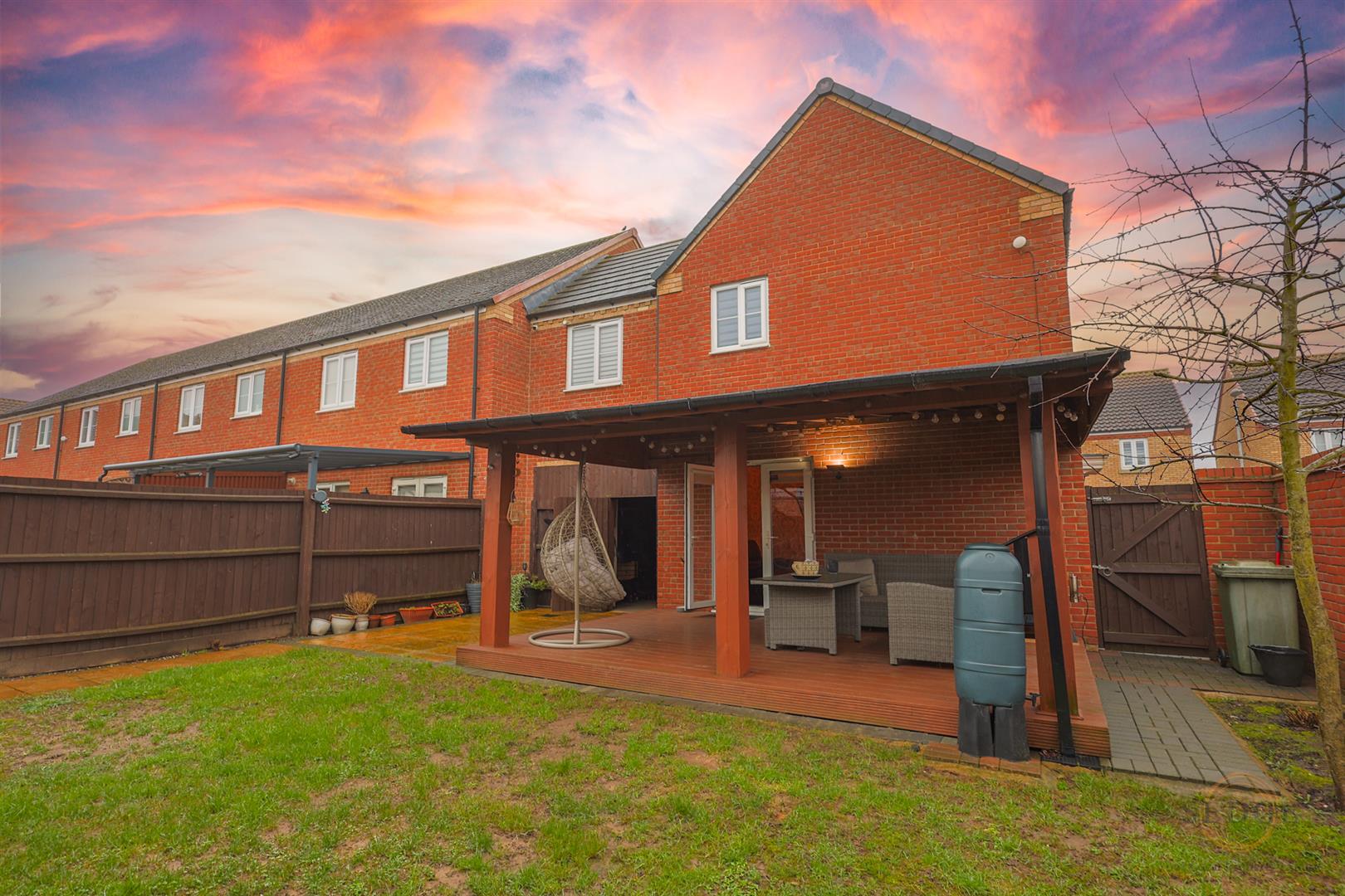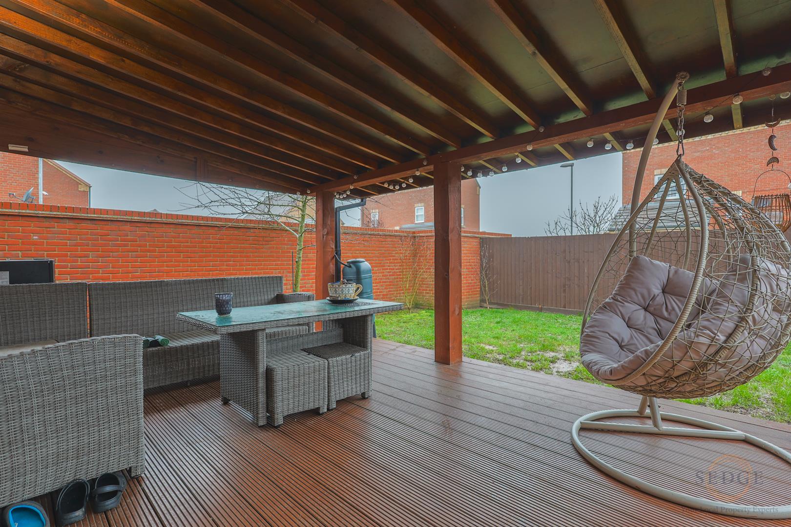To the rear of the property is a carport providing parking for two vehicles, along with a garage and an additional parking space to the front. The rear garden features a quality-built covered patio area, offering valuable additional outdoor space and protection from the rain, ideal for outdoor dining and entertaining throughout the year.