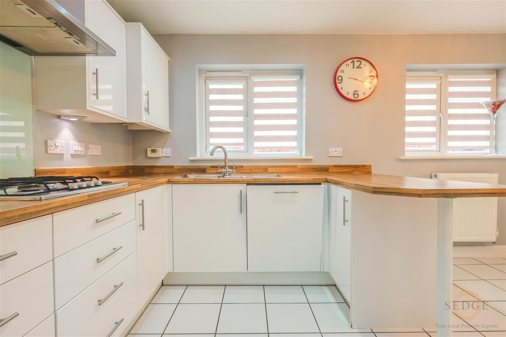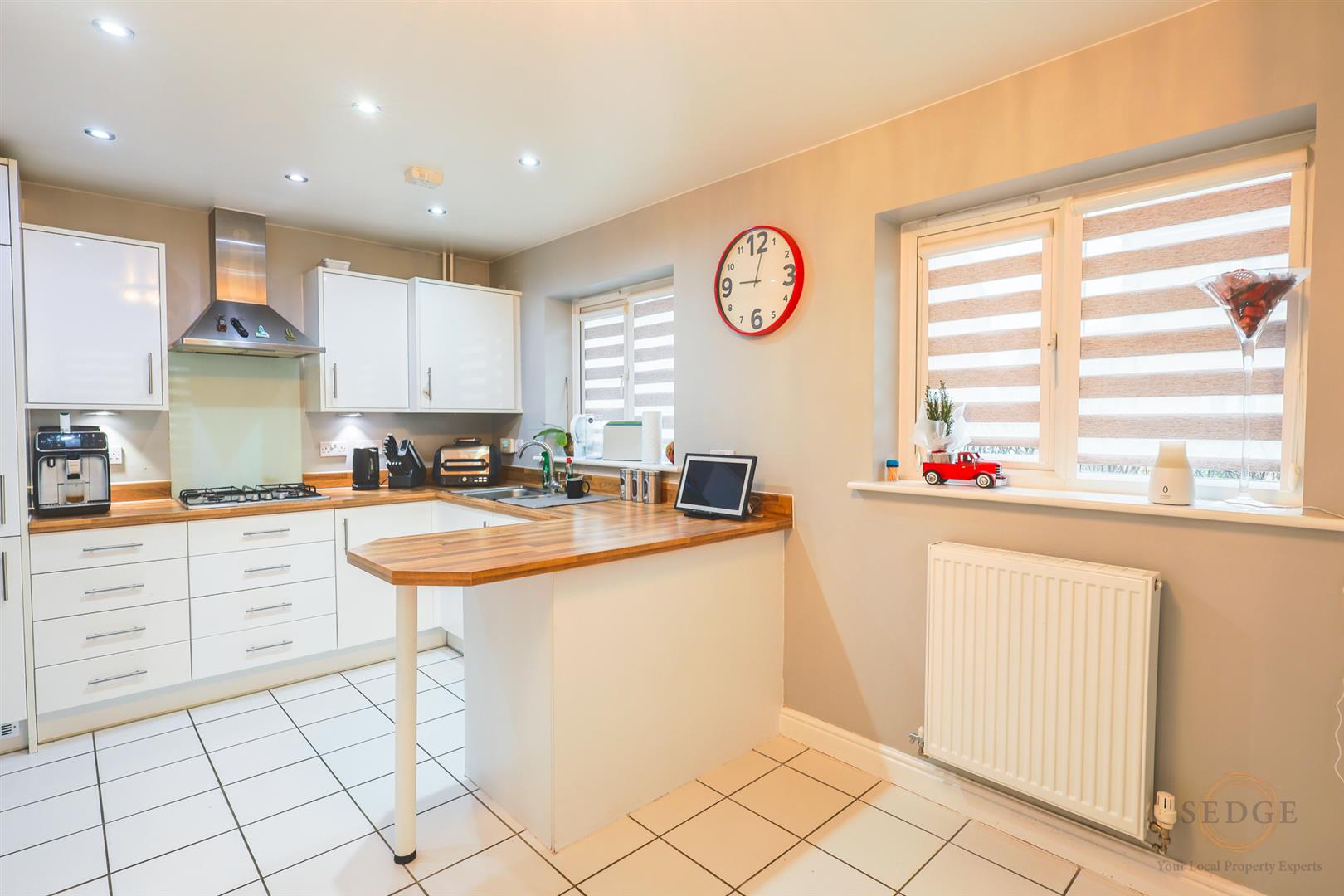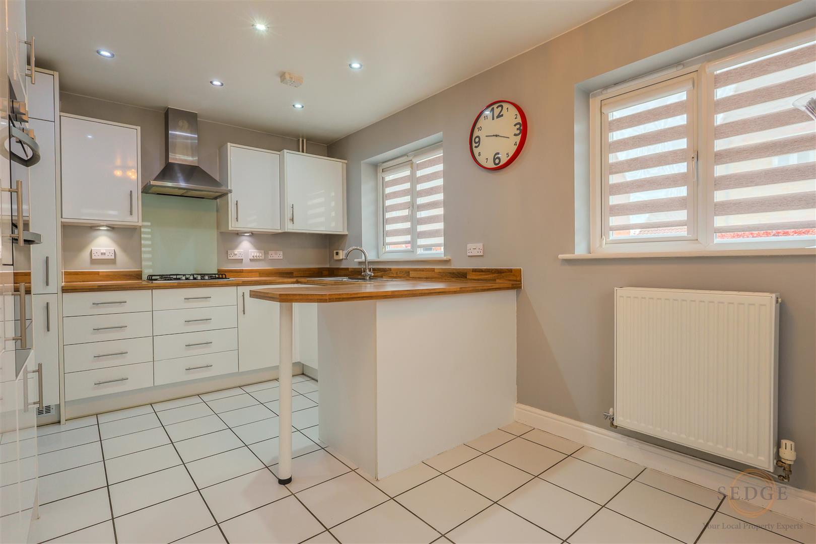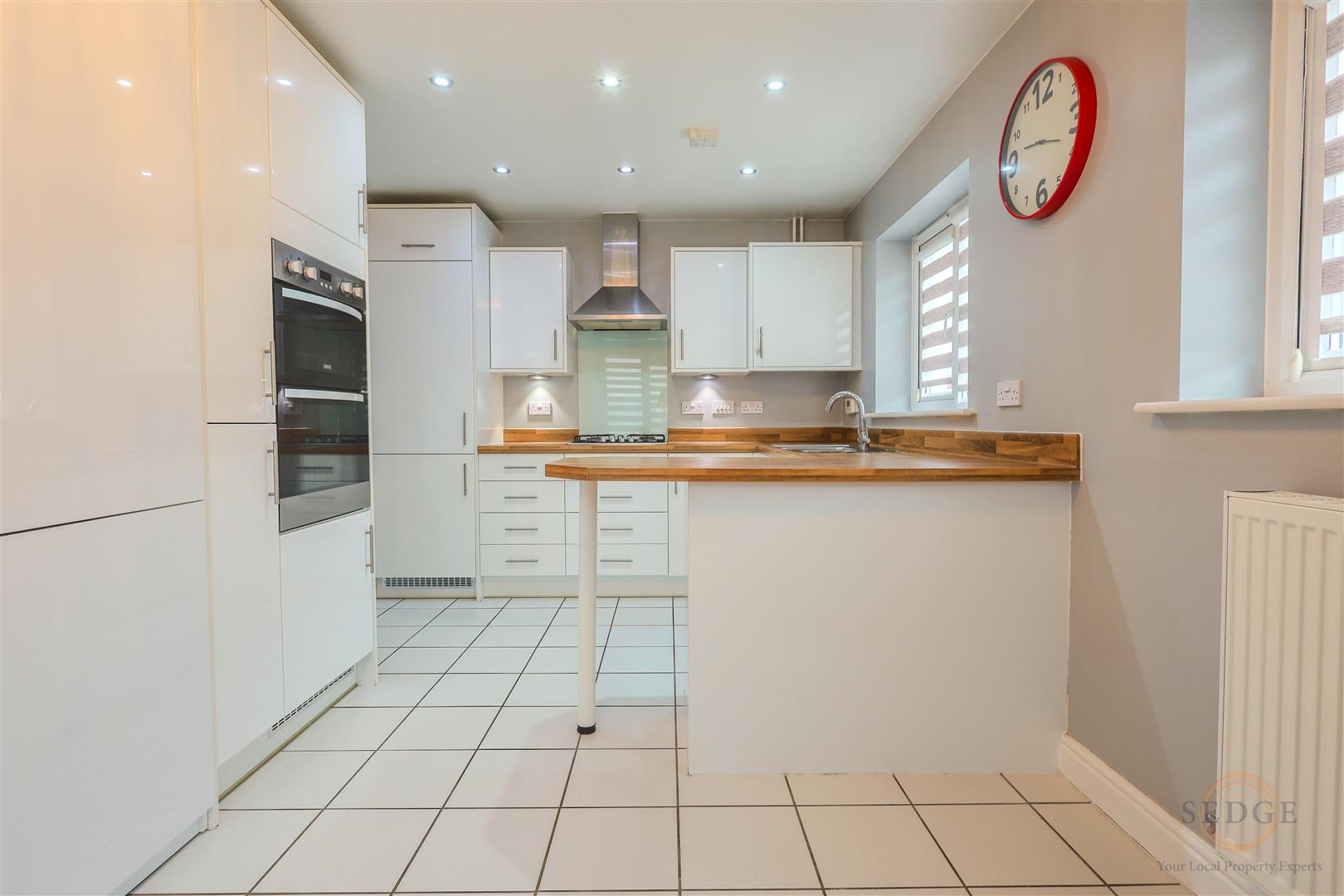 Fitted with matching base and eye-level units with worktops over, stainless steel sink with drainer, integrated electric oven, four-ring gas hob with extractor hood, and breakfast bar. Inset ceiling lights, tiled flooring and uPVC windows to the front and side elevations. Door leading to the lounge.