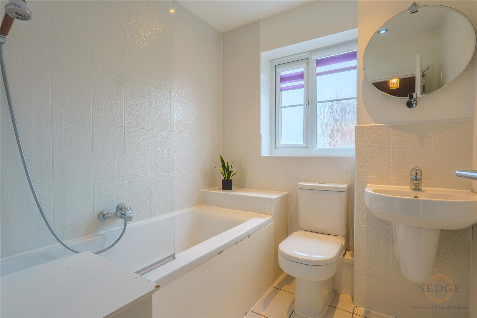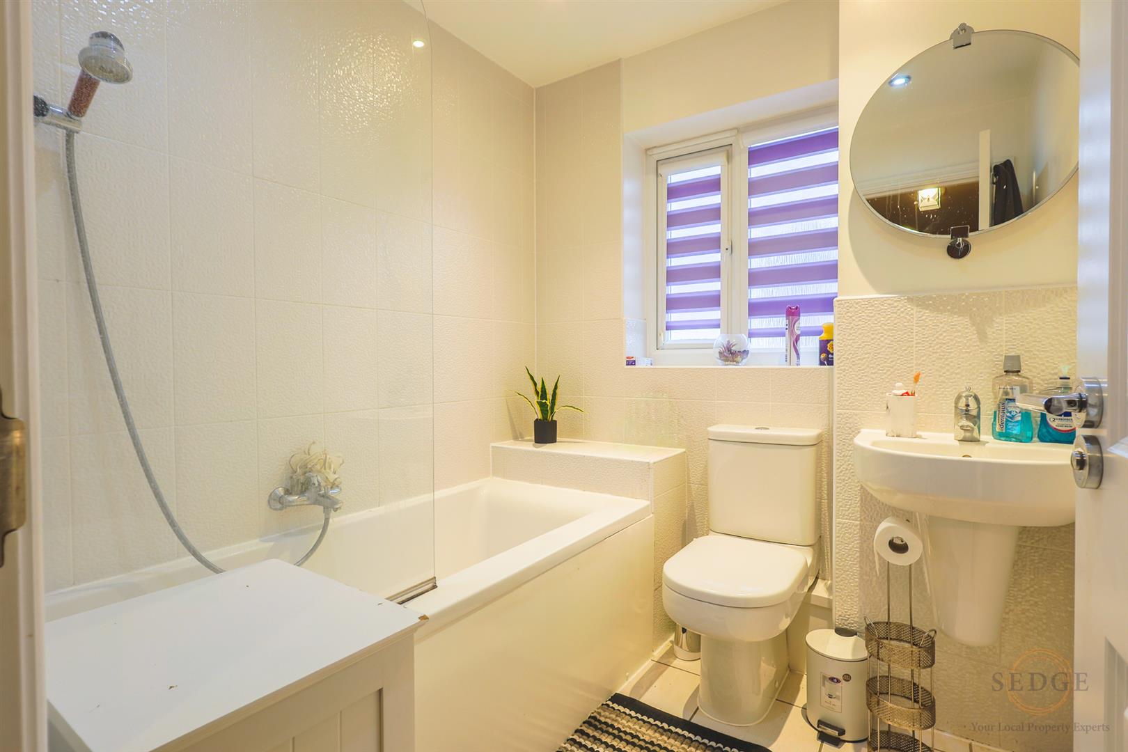 Three-piece suite comprising bath with shower over, hand wash basin and WC. Tiled flooring, ceiling light and frosted uPVC window to the side.