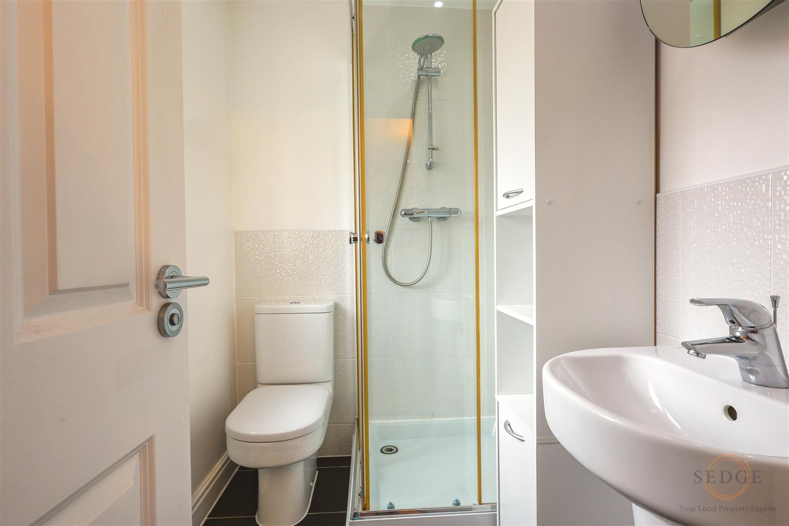 Tiled flooring and splashbacks, corner shower cubicle, WC, hand wash basin, ceiling light and frosted uPVC window to the front.