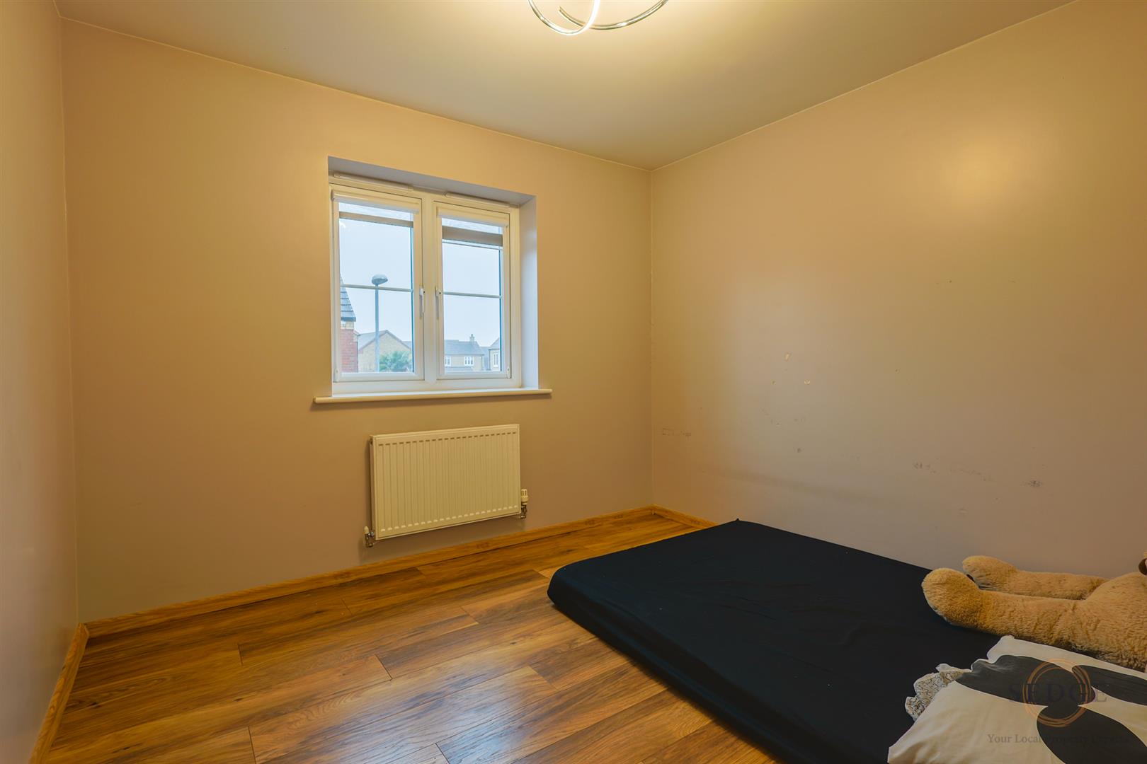 Double bedroom with laminate flooring, ceiling light and uPVC windows to the side elevations.