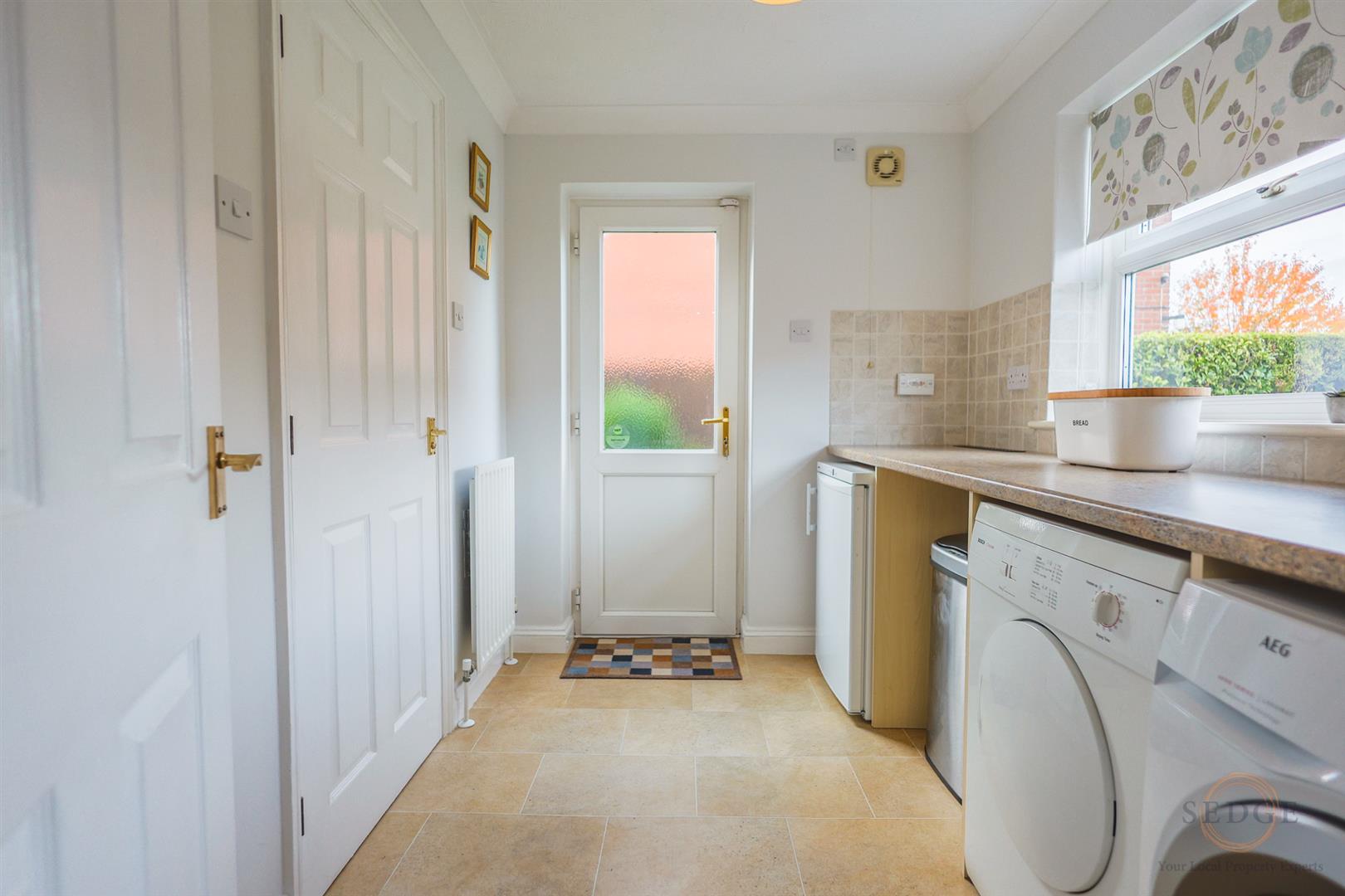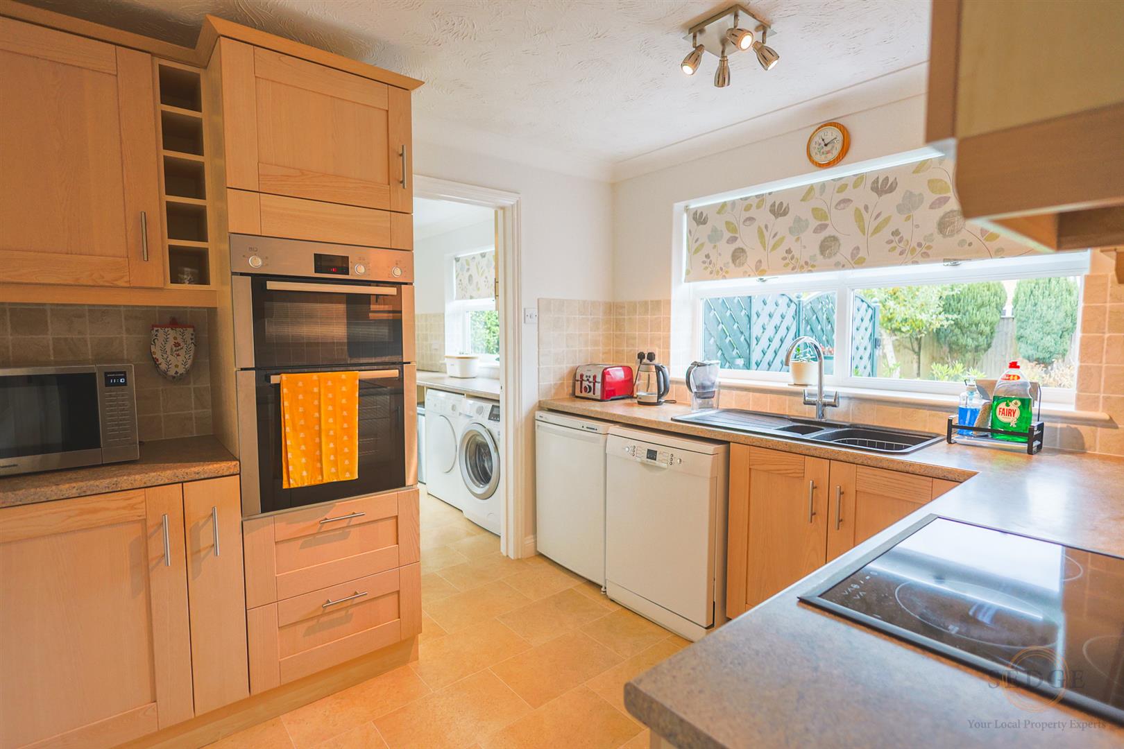 Rear-facing with window overlooking the garden and door to utility room. Ample space for appliances and cabinetry.