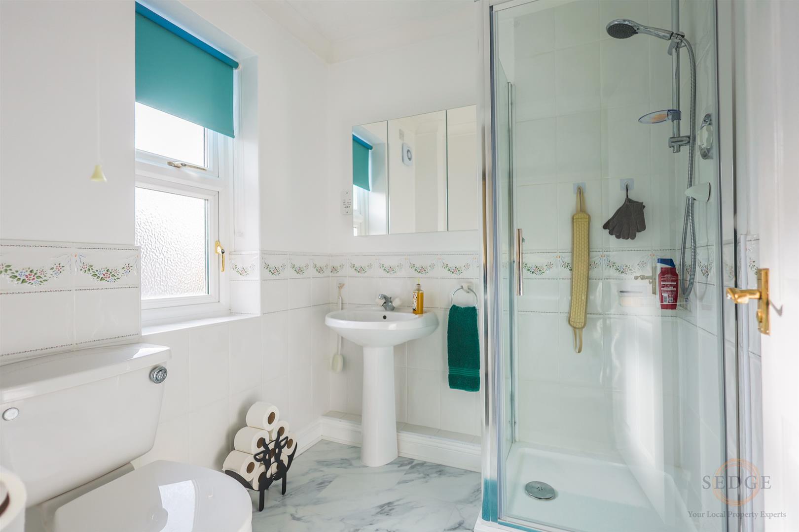 Private en-suite with front window, comprising shower, WC, and wash basin.