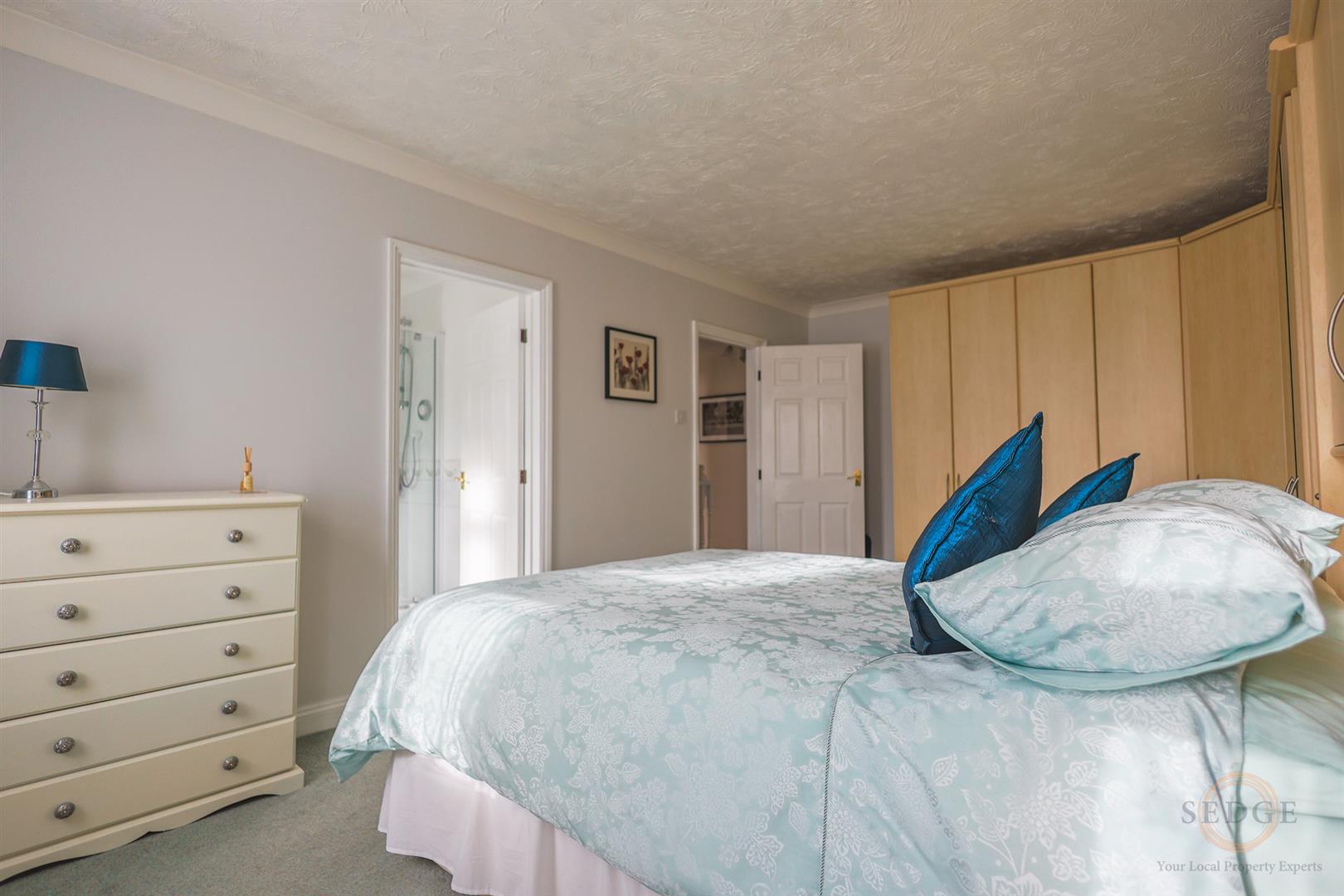 Impressive principal suite with two front-facing windows, two built-in storage cupboards, and two double doors (wardrobes). Door to en-suite.