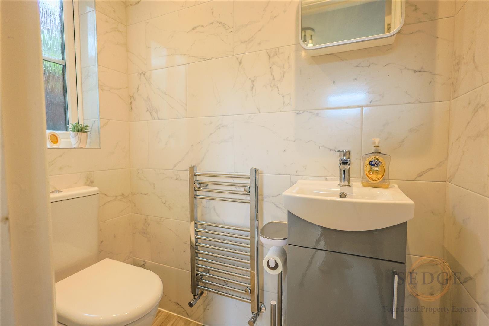 UPVC double glazed window to side aspect, wash hand basin and WC, heated towel rail.