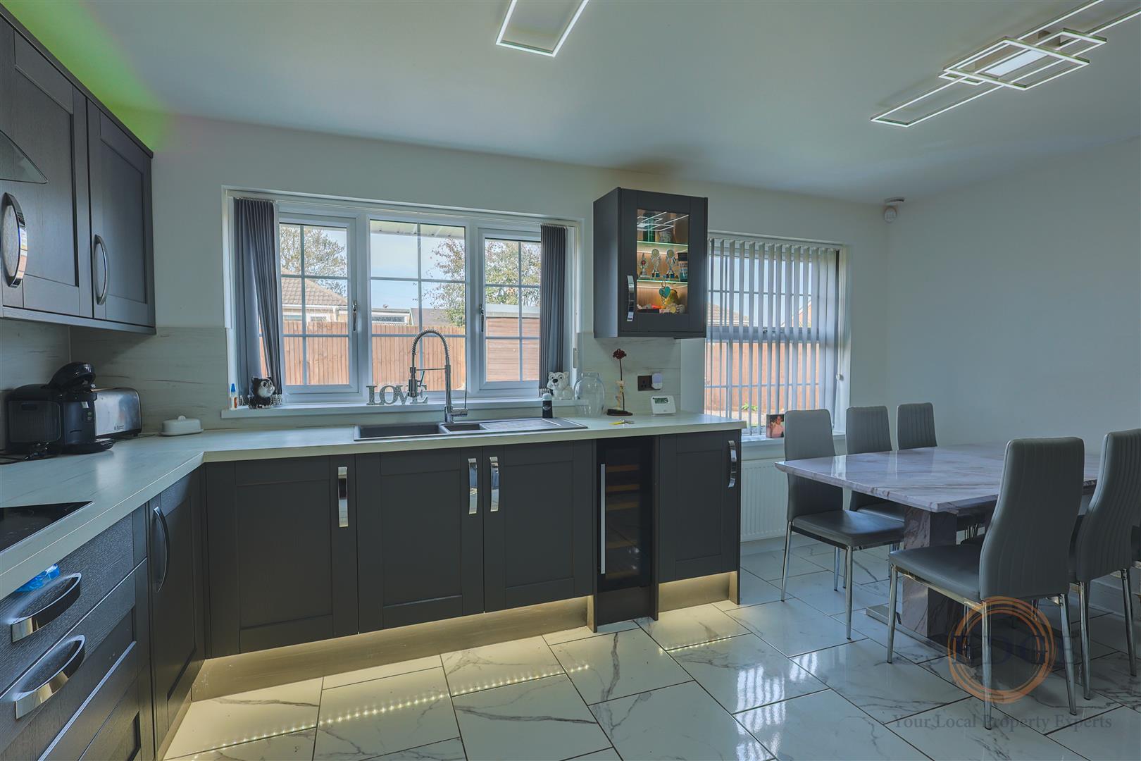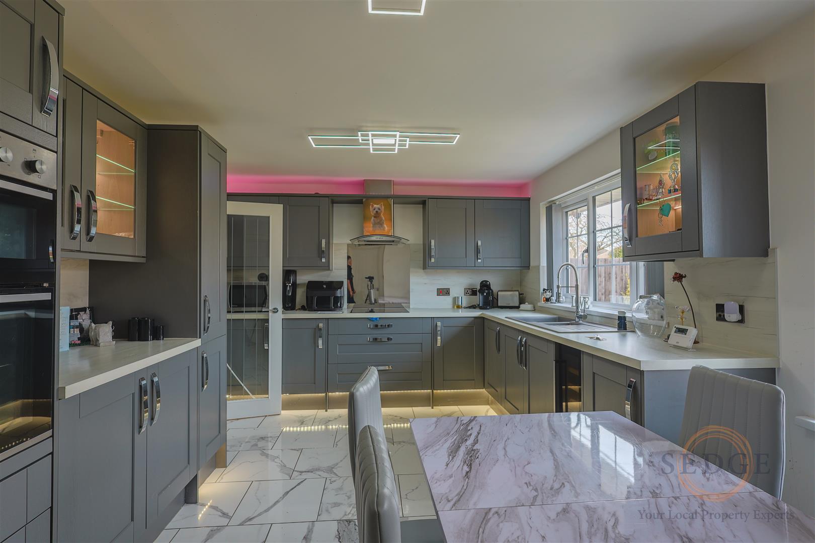 A practical addition with matching storage units and worktops, tiled splashbacks, and plumbing for a washing machine, along with space for a tumble dryer. There’s also an integral dishwasher for added convenience.