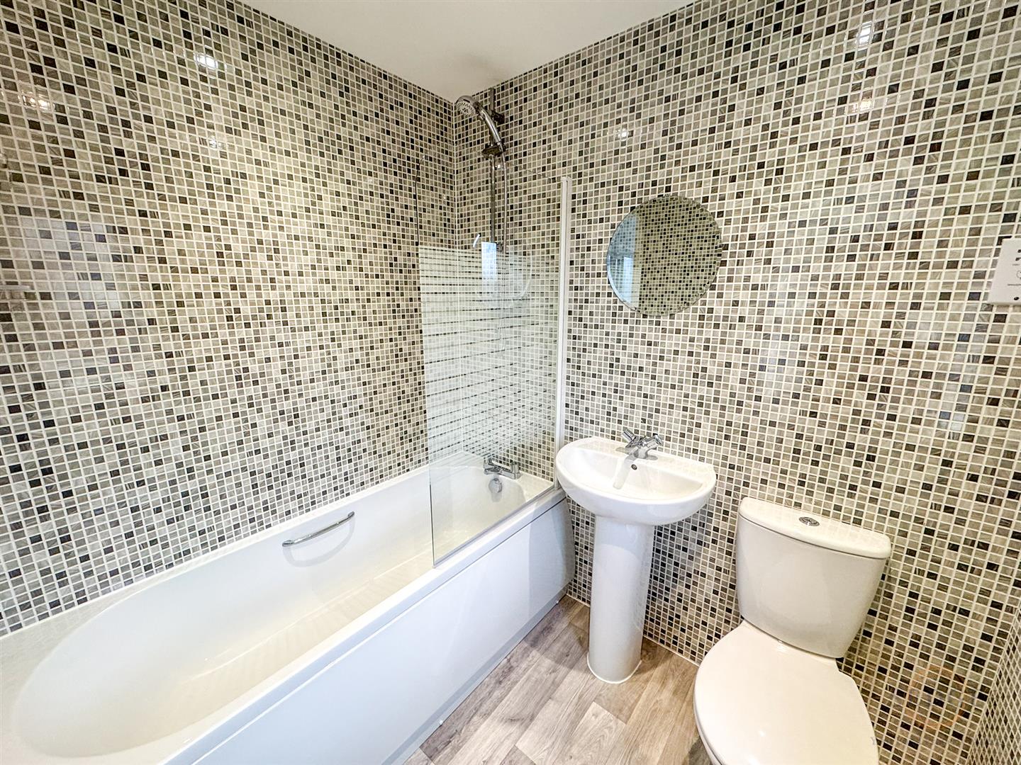 Modern bathroom fitted with a three-piece suite comprising panelled bath with thermostatic shower over, pedestal wash hand basin and close-coupled WC. Fully tiled walls, vinyl flooring, radiator and extractor fan.