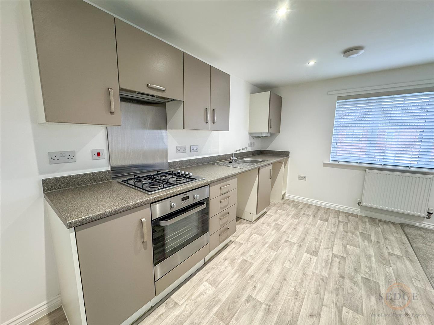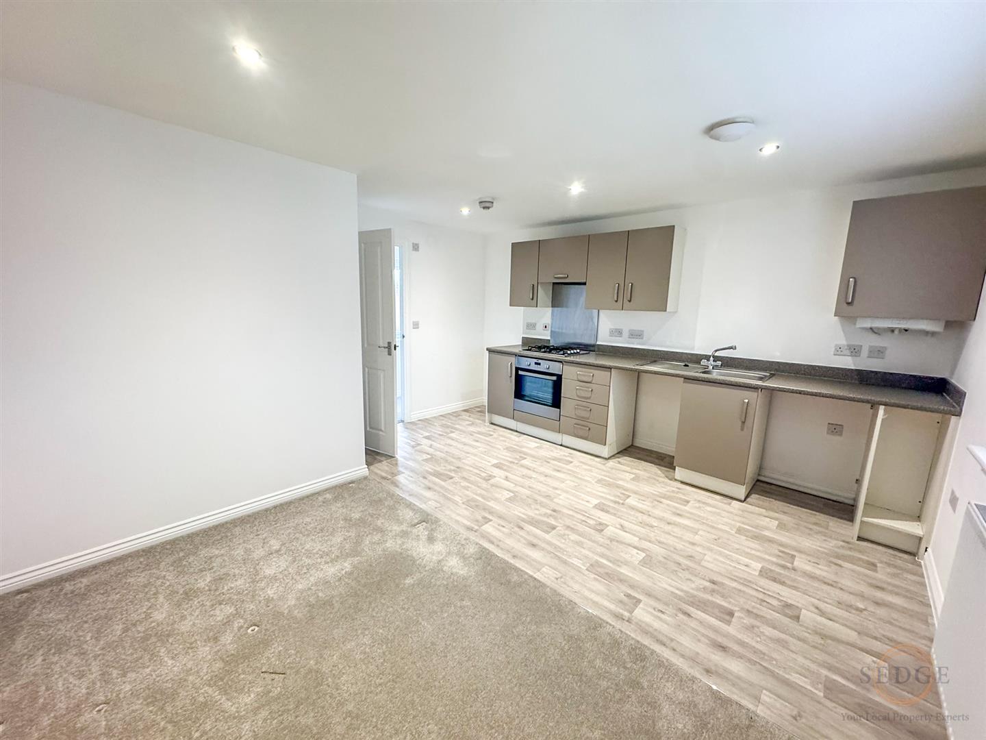 Bright open-plan living space with double glazed window to the front, vinyl flooring and radiator. The kitchen is fitted with a range of base and eye-level units with roll-edge work surfaces, stainless steel sink with mixer tap, four-ring gas hob with extractor over, integrated oven and grill, and space and plumbing for a washing machine and fridge freezer.