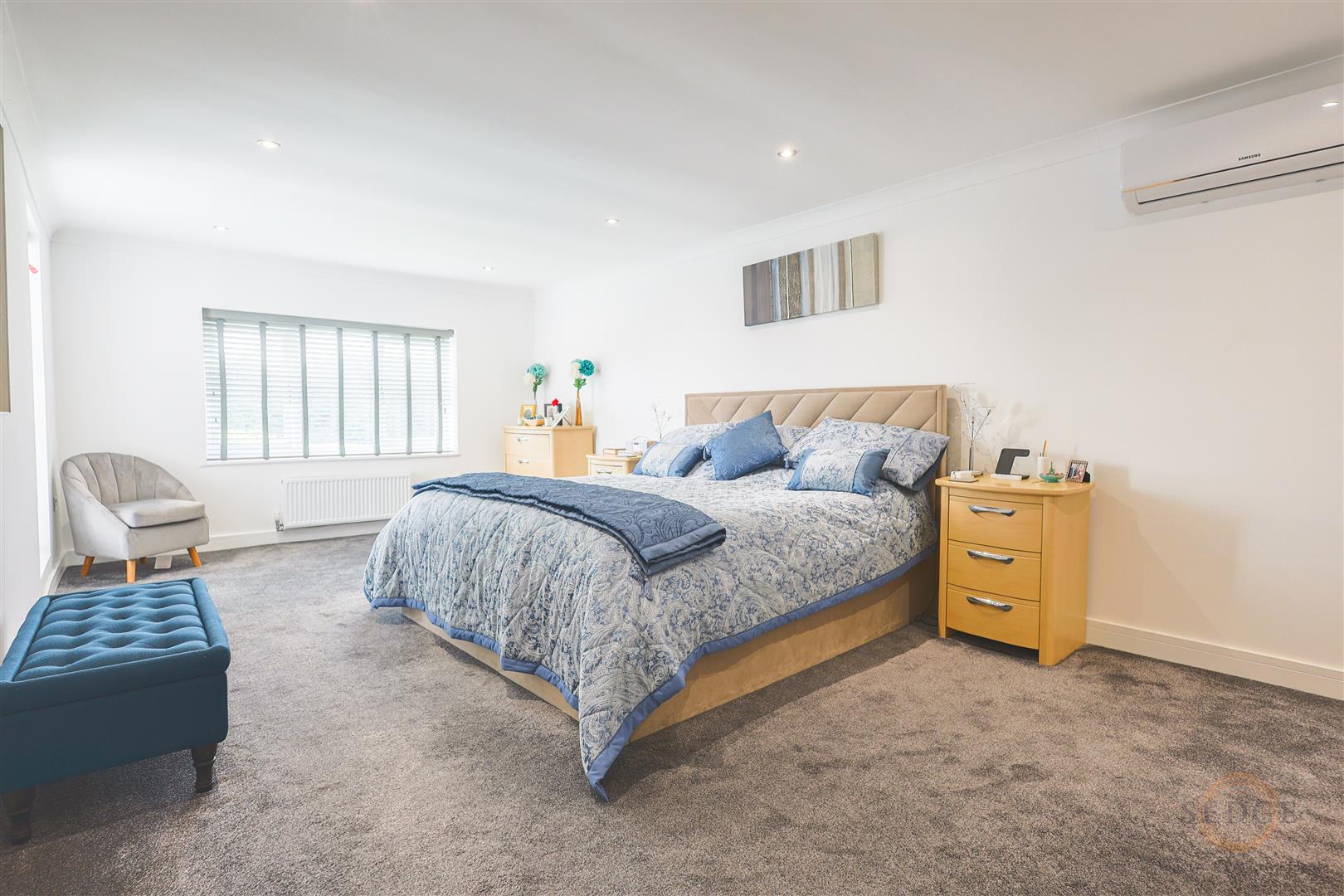 Upstairs, the property continues to impress with five well-proportioned double bedrooms. The principal bedroom with fitted air conditioning and it benefits from a dressing room and en-suite shower room, while a further bedroom also enjoys its own en-suite. A contemporary family bathroom serves the remaining bedrooms and features both a freestanding bath and separate shower. The landing is spacious and includes useful storage.