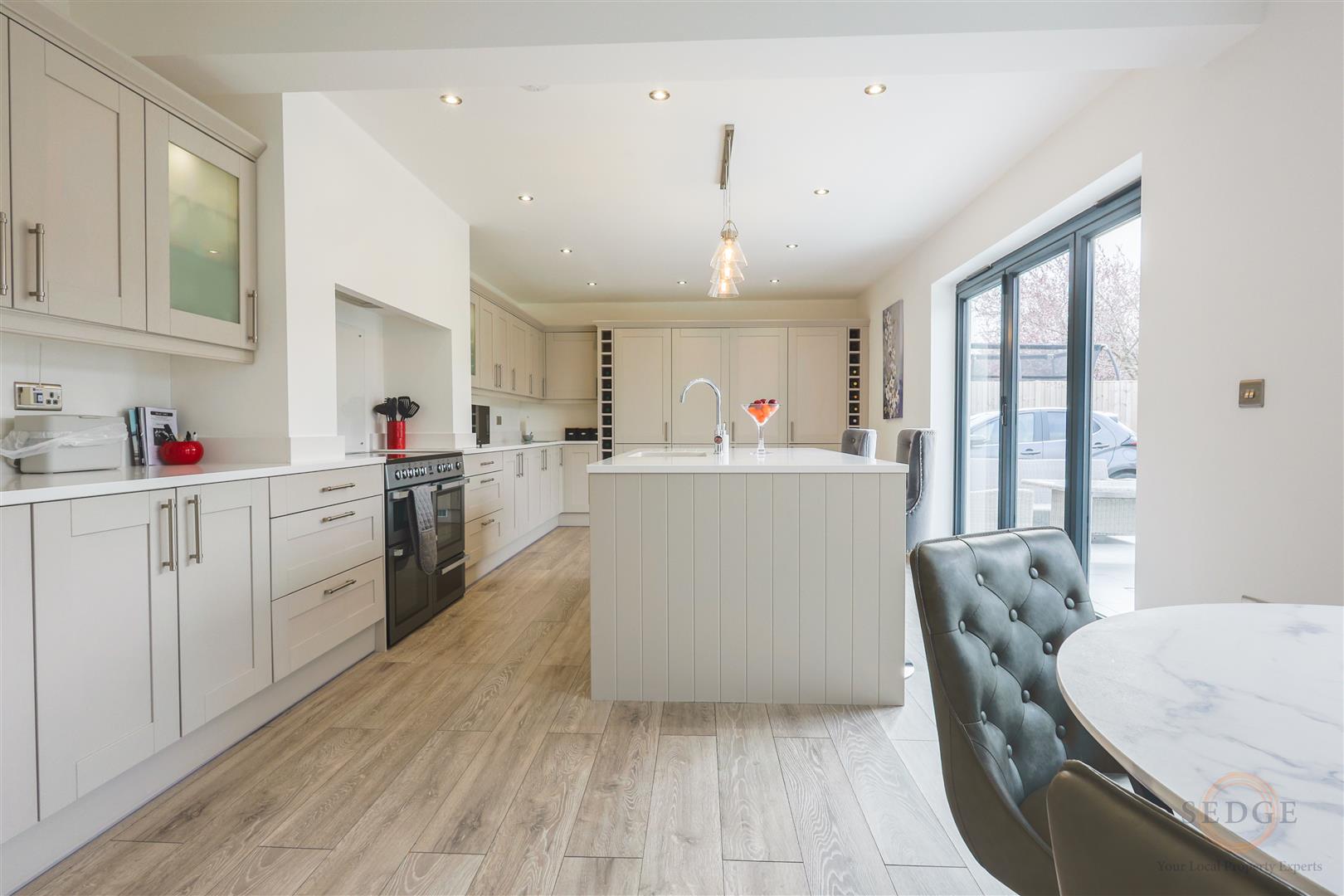 The impressive kitchen measures approximately 29m² and features extensive cabinetry, quartz worktops, integrated appliances and bi-folding doors opening onto the rear patio, creating a fantastic indoor-outdoor living space. With integrated appliances including range cooker, dishwasher, large fridge freezer, boiling hot water tap.
