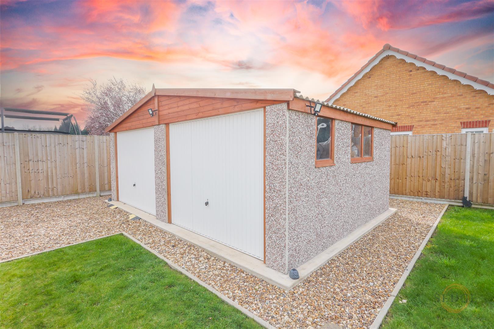 To the rear, the property features a fully enclosed garden with a newly turfed lawn, porcelain patio and external lighting. A concrete-built double garage provides excellent secure parking and additional storage. The property also benefits from ample off-road parking.