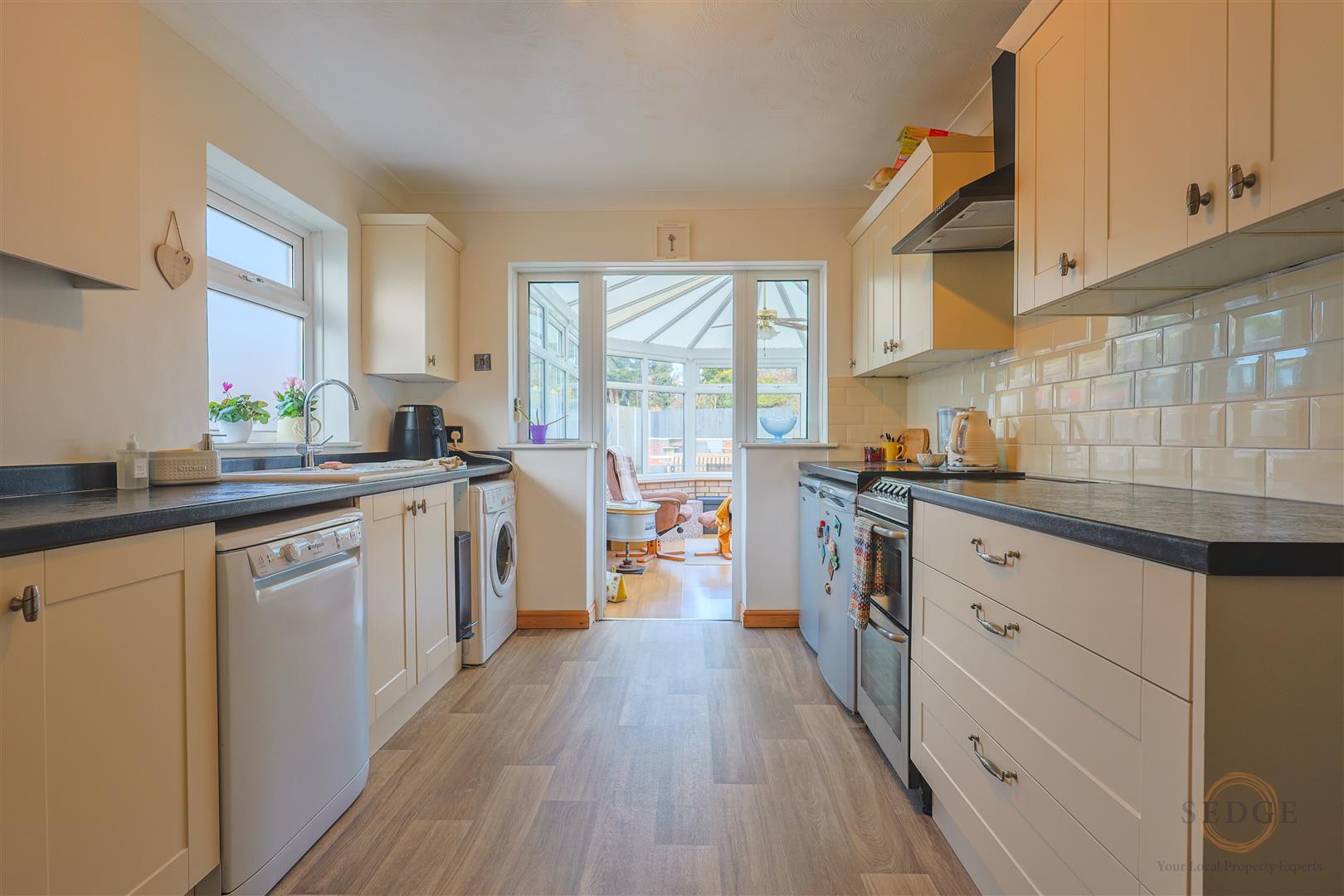 This beautifully presented, chain-free two-bedroom bungalow offers a well-laid-out and comfortable living space, perfect for relaxing or entertaining. The spacious lounge/diner features a cozy log burner and an open-plan layout, creating a warm and inviting atmosphere. The modern newly fitted kitchen provides ample space for cooking and dining, while the conservatory at the rear floods the home with natural light and offers a wonderful view of the garden. Both bedrooms are well-proportioned, complemented by a family shower room with newly fitted vinyl flooring with convenient storage cupboard.