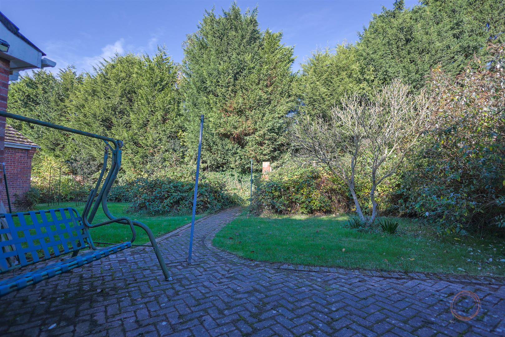 The property is approached via a block-paved driveway providing off-street parking for several vehicles, flanked by mature shrubbery and leading to the front porch and integral garage. Gated side access opens to the stunning wrap-around garden – predominantly laid to lawn with paved patio terraces ideal for al-fresco dining, all privately enclosed and meticulously landscaped.