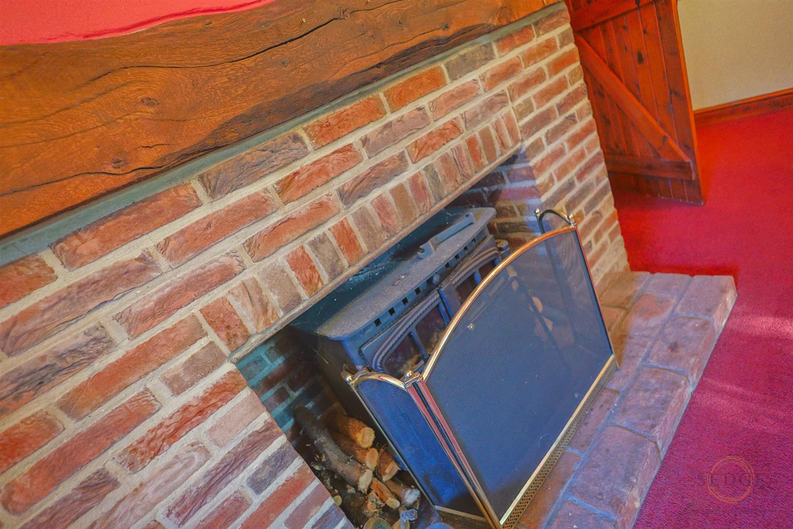 A striking triple-aspect reception room with three double-glazed windows to side and one to front. Centrepiece wood-burning stove with rustic wooden mantel, exposed ceiling beams, TV point, carpet, two radiators.